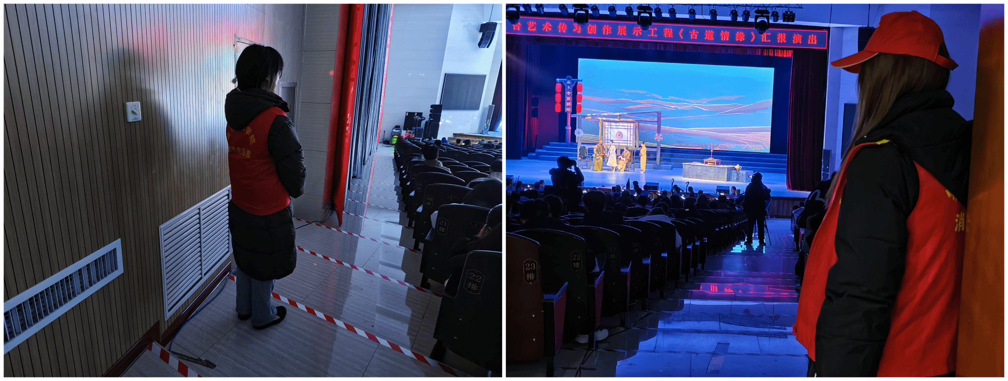 演出期间,志愿者们分别驻守在演出场地的出入口、观众席及后台区域,实时观测现场情况。同时,做好了应对突发状况的应急准备工作,保持通讯畅通,随时待命。志愿者们始终坚守岗位,保障演出全程顺利进行。