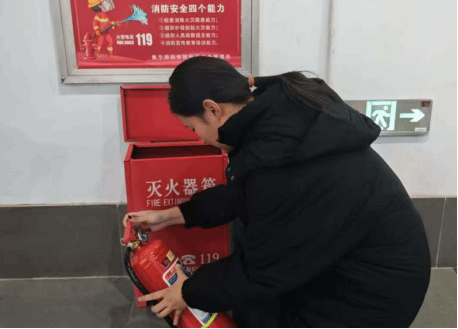 随后,志愿者们分组前往各楼层搬运消防器材。全体成员秉持认真负责的态度,对灭火器及灭火器箱轻拿轻放、谨慎操作,将所有消防器材逐个搬运至指定位置,集中进行分类存放与保养。