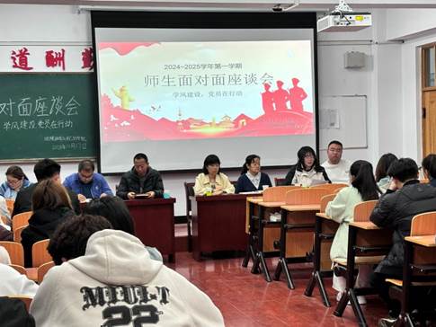 随后,两个教师党支部书记分别介绍了本次座谈会的目的和意义,强调了学风建设对于学院整体发展的重要性,鼓励学生们敞开心扉,畅所欲言。与会学生就课程学习、职业规划、考研考公、生活困难等方面提出了问题,分享了学业上的困惑和心得,老师们针对学生的问题进行一一解答和回应,并希望师生之间能够积极沟通交流,实现“教”与“学”的互动,使同学们快乐充实地度过大学生活,并学有所成。
