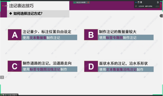 会上,培训讲师用生动形象的语言为同学们详细的讲解如何制作一幅专题图,介绍质底法、点值法、点密度法的制图方法,讲解注记表达技巧。同时,培训讲师结合培训内容,为学生们布置课后作业。