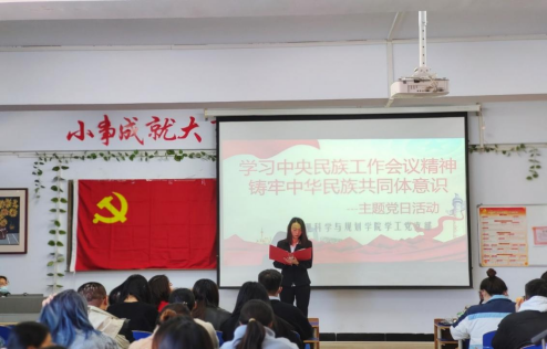 为深入学习贯彻习近平总书记在中央民族工作会议重要讲话--以铸牢中华民族共同体意识为主线,推动新时代党的民族工作高质量发展,10月21日,地理科学与规划学院学工党支部在主教楼620举办“铸牢中华民族共同体意识”主题党日活动,党总支书记刘晓霞、党总支副书记黄倩、学工党支部书记赵娜以及预备党员、发展对象、入党积极分子共60余人参加本次活动。