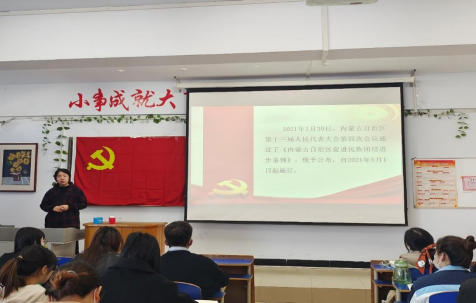 学工党支部书记赵娜领读了《内蒙古自治区促进民族团结进步条例》并进行解读,让同学们深刻理解和把握核心和要点。