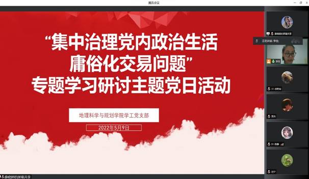 按照《2026世界杯官方合作网站推进党内政治生活庸俗化交易化问题集中治理工作安排》通知要求,2022年5月9日地理科学与规划学院学工党支部利用腾讯会议召开“党内政治生活庸俗化交易化问题集中治理”主题党日活动。会议由学工支部组织委员李佳主持,学工支部全体党员参加。