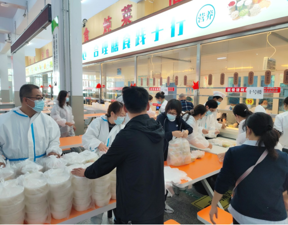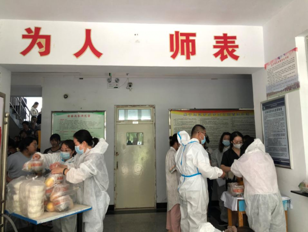9月7-10日,第一批学生返校,根据疫情防控有关规定,学校实行3天静默管理,为保障给静默管理状态的同学们送上热腾腾的饭菜,老师们分餐的分餐,派送的派送,他们把手中的粉笔、书本替换成了打包的盒子、分装的袋子,纷纷化身为“外卖员”。他们即使汗流浃背,也没有一刻松懈,快捷高效地完成了工作,用责任和担当为学生的生活保驾护航。