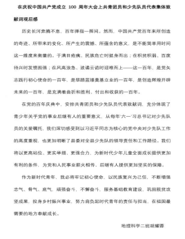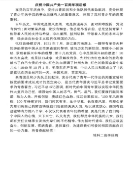 本次团日活动重点学习了党的十九届六中全会精神,并观看了在庆祝中国共产党成立100周年大会上共青团员和少先队员代表集体致献词视频回放,同学们有感而发,并撰写了观后感与随笔。