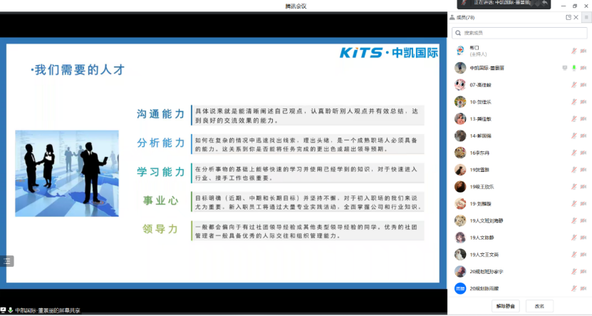 为进一步推进2023届毕业生就业工作,4月21日晚上19:30,地理科学与规划学院与北京中凯国际研学旅行股份有限公司联合举办线上招聘宣讲会。会议由学团办副主任邢晓彬主持,学院副院长暴向平、党总支副书记黄倩、办公室主任刘晓靓、辅导员李瑞英、2019级人文地理与城乡规划一班班主任李佳以及2019级与2020级人文地理与城乡规划专业全体学生参加。