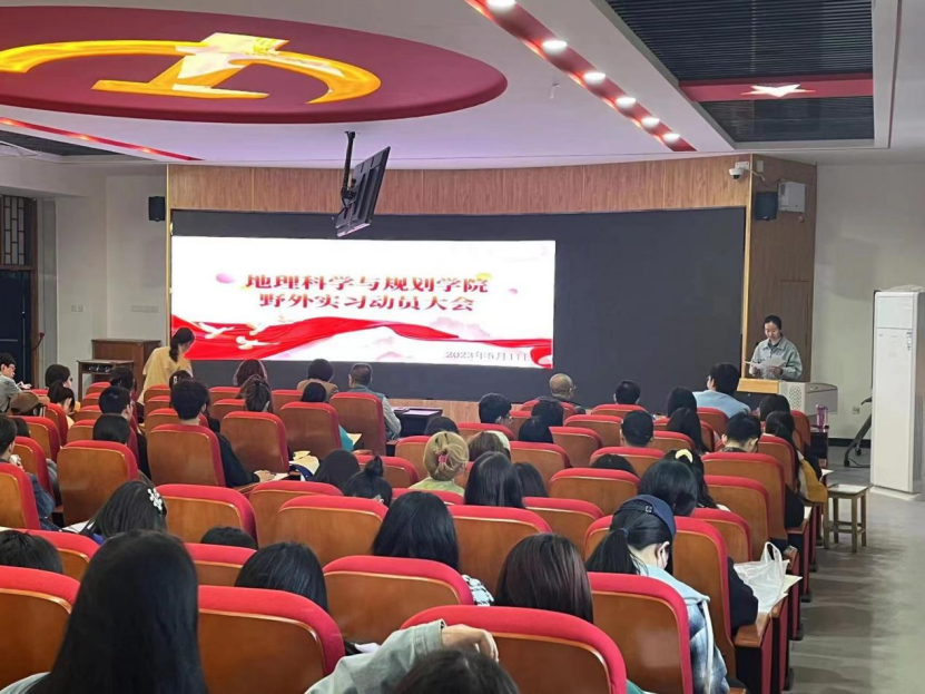 为做好地理科学与规划学院实践课程教学工作,顺利开展学院地理科学专业、人文地理与城乡规划专业野外实习,5月11日下午,地理科学与规划学院召开野外实习动员大会。学院党总支书记刘晓霞、副院长暴向平、党总支副书记黄倩、副院长刘彩凤、各实习点带队教师、各实习班级班主任以及参加本次野外实习的247名同学参加会议。会议由学院办公室主任刘晓靓主持。