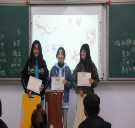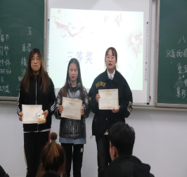 比赛以经典诗文朗诵、汉字听写、推断成语等环节展开,由主持人播报汉字词语和字词释义,参赛选手在规定时间内写出规范的汉字词语。比赛现场精彩纷呈,各组参赛选手信心满满,认真听题,沉着思考,冷静作答,规范书写。最终经过紧张激烈的四轮比拼、角逐,王加莉、靳慧慧、姜莹三名同学获得“第三届汉字听写”冠军组。