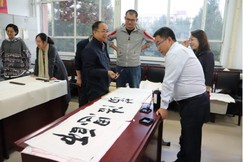 讲座结束后,梁能伟、全翀凤、李文彪以及世界杯官网多年从事书法教学的资深老教师曹宇、田振国现场挥毫,老师和同学们认真观摩、学习、欣赏。