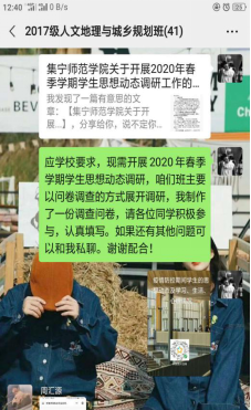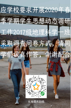 6月15日至19日,2017级、2018级四个班级通过电子调查问卷和视频调研的形式开展了2020年春季学期大学生思想动态调研活动。通过本次调研可以看出,我院大学生高度赞同我们国家应对新冠疫情采取的各项措施,学生整体精神面貌良好,疫情期间能够积极投入线上学习。他们普遍关注国内外政治、经济及疫情防控形势,坚决拥护、支持以习近平同志为核心的党中央和政府的方针政策,政治方向明确,热爱祖国,具有较高的政治敏锐性和辨别力,对我国战胜疫情和经济持续稳定发展充满信心。