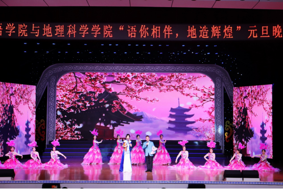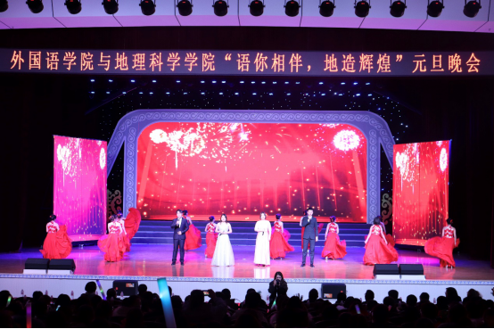 伴随着一首《祖国不会忘记》拉开帷幕,元旦晚会正式开始,首先由外国语学院院长闫晓云、地理科学学院院长王培青致辞。他们带来了新年的美好祝福,对全体师生在2019年所做的工作与努力给予了充分肯定,并对此表示衷心的感谢。同时,希望全体师生不骄不躁继续奋斗,力争在新的一年里谱写更为绚丽的篇章。随后,同学们用自己精心准备的节目,载歌载舞表达了对美好生活的向往和对老师辛勤付出的感激之情。《少年中国说》、《放飞中国梦》、《我们都是追梦人》表达了新时代中国青年奋斗方向、奋斗目标、奋斗源泉的具体论述。精彩的节目使整个会场气氛激扬澎湃、掌声连连,历时近两个小时的晚会在喝彩声中完美落幕。