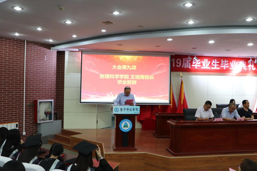 地理科学学院院长王培青致毕业辞。王培青代表地理科学学院全体师生对毕业生送上最热烈的祝贺和最美好的祝愿,他对毕业生提出共勉:希望你们做一个终身学习、勤于思考的人;做一个怀揣梦想、求实创新的人;做一个心存敬畏、行知廉耻的人;做一个心怀感恩,热爱生活的人。他说,学生们不忘初心、奋力拼搏、成就梦想的精神,奋斗的足迹将永远铭刻在母校的历史上,愿同学们在此扬帆起航,百舸争流挂云帆。
