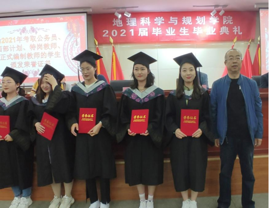 毕业典礼在激昂的国歌中拉开了序幕。地理科学与规划学院党总支副书记张强讲话。他希望同学们要深怀感恩之心,感恩父母,感恩母校,感恩社会。要学会与人和谐相处,不断增强责任意识,他勉励毕业生珍惜韶华,脚踏实地,把远大抱负落实到实际行动中,在激昂青春、奉献社会的进程中书写无愧于时代的壮丽篇章。