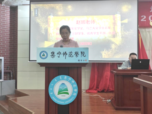 暴向平老师宣读2021届本科毕业生名单;王腾老师宣读2021届毕业生考研上线名单、考取公务员、特岗教师、西部计划以及教师正式编制名单;赵娜老师宣读了获得乌兰夫奖学金、国家奖学金、自治区级“三好学生、优秀学生干部、优秀毕业生”名单。