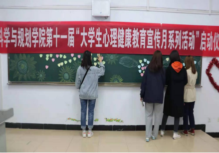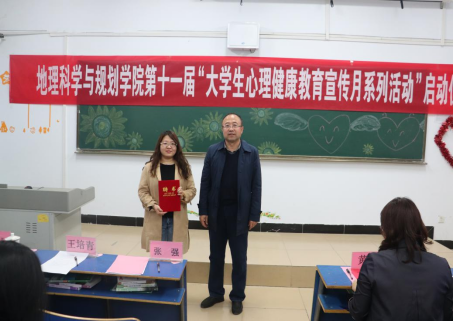 地理科学与规划学院院长王培青为钟华老师颁发“地理科学与规划学院心理辅导站指导教师”聘书并宣布第十一届心理健康教育宣传月活动正式启动。随后师生们共同抒写了心灵寄语。