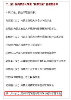 根据《关于开展第十届内蒙古大学生“桃李之星”选树活动的通知》(内党宣发电〔2022〕14号)有关要求,经评选及研究,2022年6月8日,第十届内蒙古年度大学生“桃李之星”名单及提名奖名单出炉。我院2019级地理科学一班学生洪月(女)入围“桃李之星”提名奖。