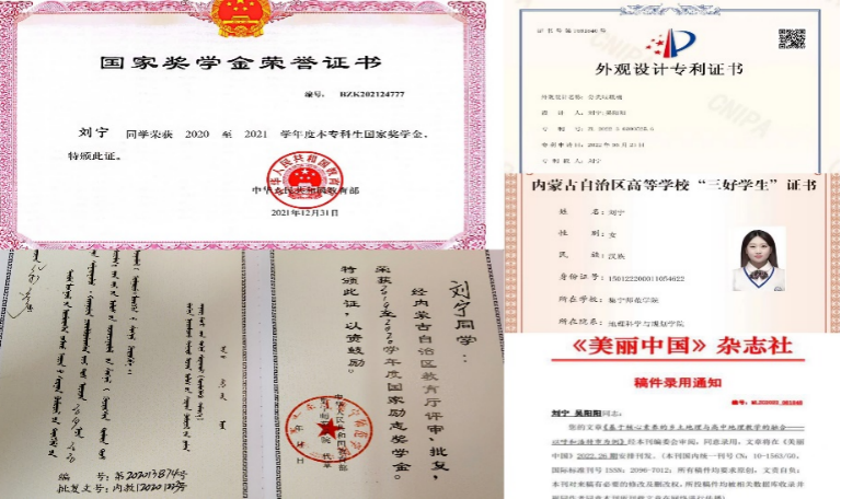 刘宁同学自入学以来便给自己制定了明确的学习目标以及合理的学业规划,认真对待每一门课程,扎实学习专业知识。专业成绩始终名列前茅,入学以来,平均学分绩点均在4.0以上,并获得了国家奖学金、国家励志奖学金、“中国大学生自强之星”、自治区 “三好学生”等国家级荣誉8项,自治区级荣誉9项,校级荣誉12项,院级荣誉8项。同时她也参与到项目和竞赛中去,并勇于提出自己的想法和创意,参与的大学生创新创业训练项目获得国家级立项1项,自治区级立项1项,在第七届国际“互联网+”创新创业大赛中获得内蒙古赛区铜奖。