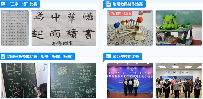 在课程实施过程中,开设地理知识组织与实践、地理制图综合实践、地理学科专题设计等实训课程,同时与“三字一话”比赛、“地理三板技能”(板书、板图、板画)比赛、地理教具制作比赛、师范生技能比赛等实践活动相结合,激发学生自主学习、自主实践的内生动力,促进了第一课堂与第二课堂的有效衔接,充分发挥了协同育人的功效。