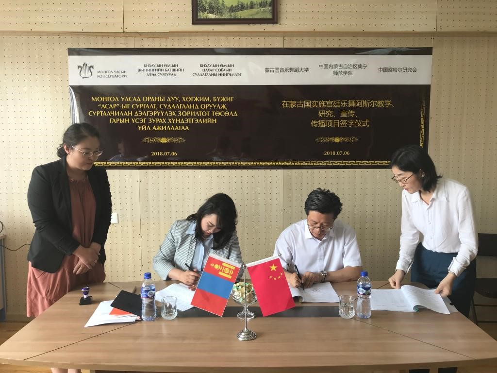 会后,双方共同签署“在蒙古国实施宫廷乐舞阿斯尔教学、研究、宣传、传播”项目合同书及实施方案,并观摩蒙古国音乐舞蹈大学教学成果展示。之后朱玉东和萨仁其木格共同接受蒙古国国家电视台的采访。