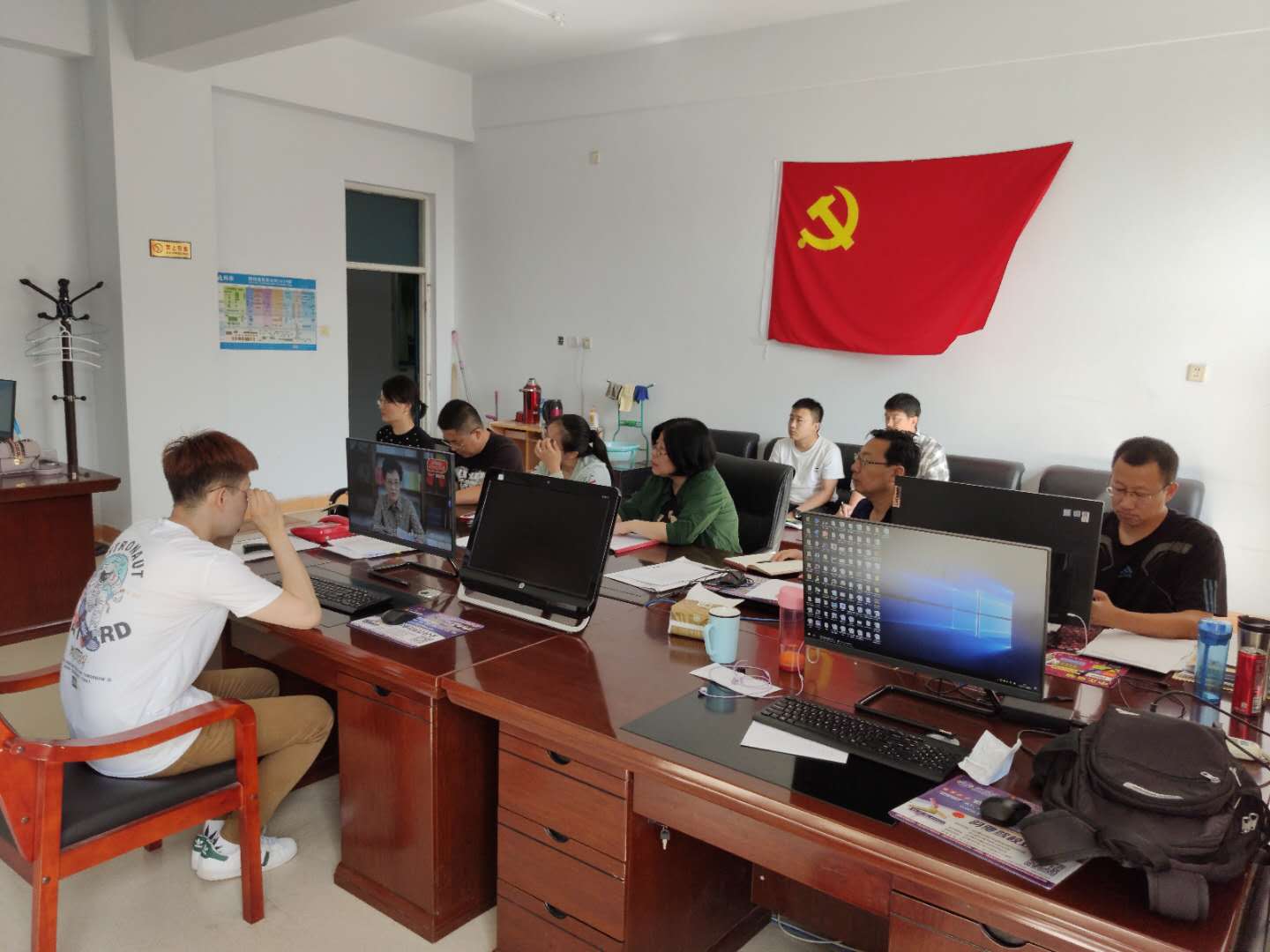 2020年7月1日上午,2026世界杯官方合作网站网络中心党支部、国资处党支部在网络楼三楼组织观看“高校党组织战‘疫’示范微党课‘七一’专场”现场直播。