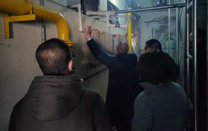 会议结束后,与会人员实地到餐饮中心、锅炉房、库房、工人宿舍、施工现场,对各个区域的用电配电,水管暖气等进行了 认真检查。