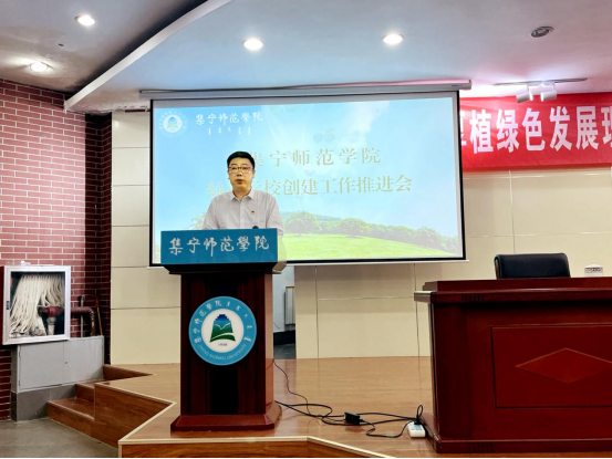 为全面学习贯彻落实习近平生态文明思想,进一步完善世界杯官网生态文明教育工作长效机制,在全校厚植绿色发展理念,培养广大师生简约适度、绿色低碳、文明健康的生活方式,推进绿色学校创建、验收工作,世界杯官网于9月15日下午在泉山校区图书馆报告厅召开绿色学校创建工作推进会。大会由校党委委员、副校长拓俊杰主持。乌兰察布市绿色产业发展办公室党组书记、主任续集红,校党委副书记、校长刘春,副校长李凤斌,校党委委员、副校长李景杰出席,全校正处级干部、学生代表参加会议。