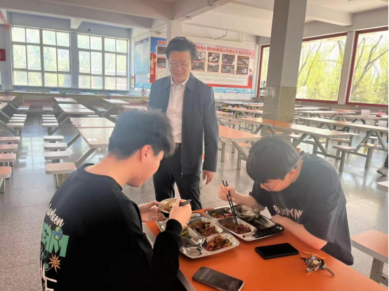 拓俊杰在与学生共同就餐时候,详细询问学生对食堂饭菜种类、质量、口味、价格、服务等方面的需求,征询学生对餐饮服务保障的意见。