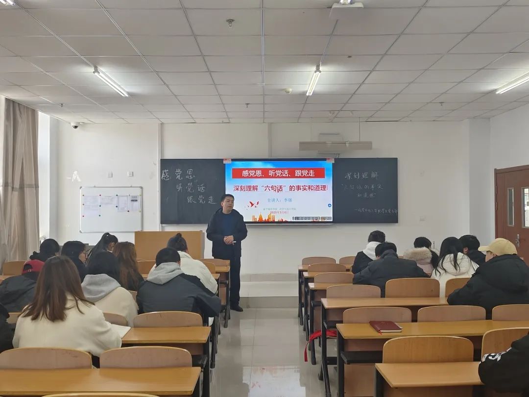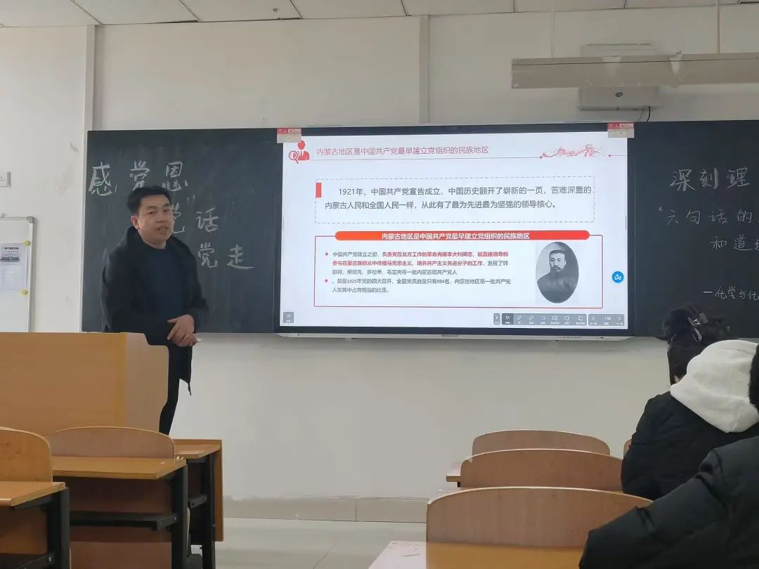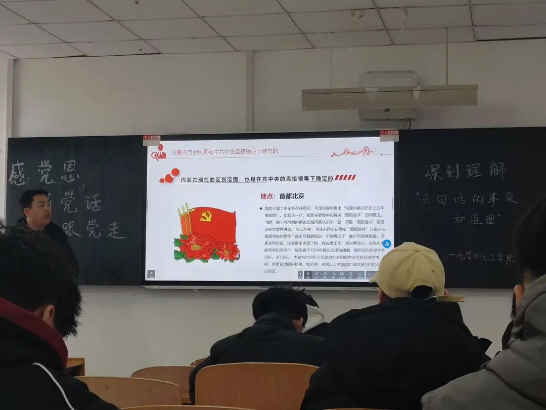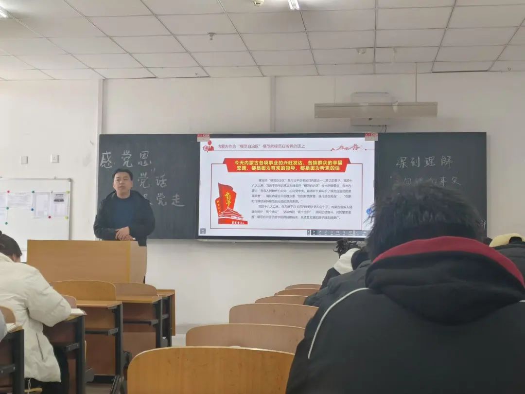 宣讲会上,党总支副书记李强系统阐释了“六句话”的深刻内涵,强调内蒙古作为中国共产党最早建立党组织的民族地区,始终在党中央的领导下发展壮大。并结合内蒙古工业发展历程,如“一五”时期包钢等重点项目的建设成就,生动展现了党中央对边疆地区的支持与关怀。通过“三千孤儿入内蒙”“最好的牧场为航天”等民族团结故事,深刻诠释了“模范自治区”的示范意义,号召师生将铸牢中华民族共同体意识融入学习和工作中。 活动通过主题宣讲、案例分析和互动研讨等形式展开,以PPT讲解、历史影像展示等多媒体手段增强感染力。学生代表在交流中表示,宣讲内容将党的理论与专业实践紧密结合,激励大家将个人成长融入国家战略需求,立足岗位践行初心使命。