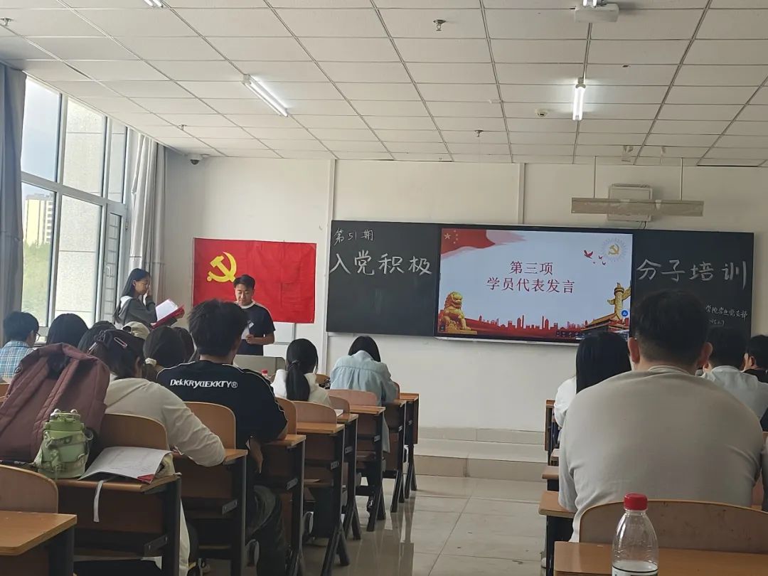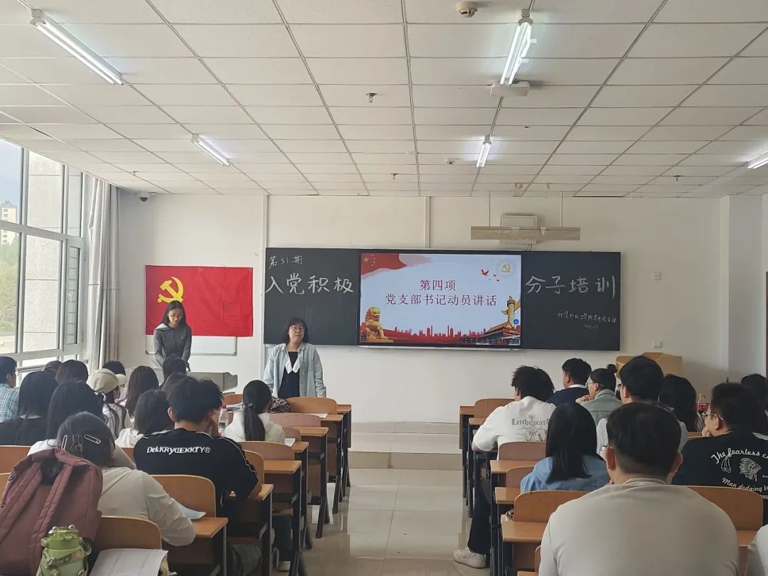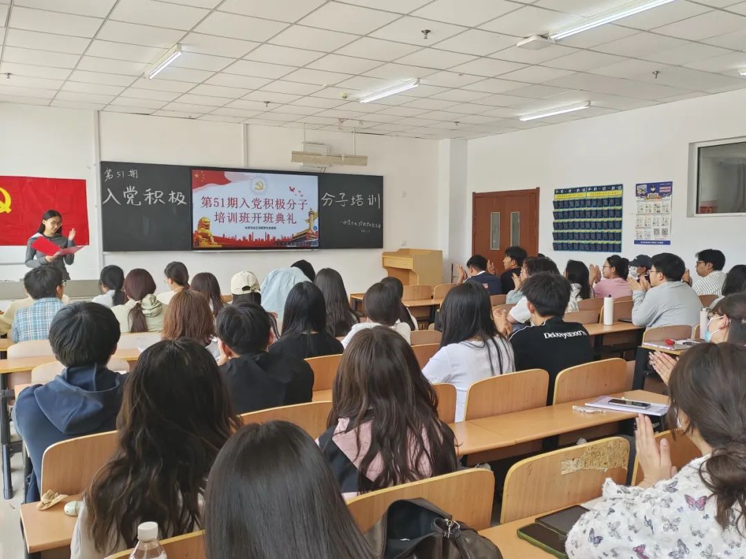 6月7日上午,化学与化工学院学生党支部第51期入党积极分子培训班开班典礼在逸夫楼103教室隆重举行。党支部书记周丹出席典礼,来自各班级的50名学员参加培训。 典礼在庄严的《国歌》中拉开帷幕。党支部干事韦钰捷首先宣读了培训方案,本次培训为期一周(共24学时),采用“专题授课+实践教学+分组研讨”模式,涵盖党的二十届三中全会精神解读、党章党史学习、深刻理解“六句话”的事实和道理等核心课程。随后,学员代表赵志翔作表态发言,表示将珍惜学习机会,以饱满热情完成培训任务。 党支部书记周丹在动员讲话中强调,全体学员要深刻认识培训意义,做到“三个强化”:一是强化理论武装,系统掌握党的创新理论;二是强化党性锤炼,自觉对标党员标准;三是强化实践担当,在岗位工作中发挥先锋模范作用。讲话最后对培训纪律提出明确要求,特别强调要严守意识形态纪律。 本次开班典礼为入党积极分子筑牢思想根基,通过系统培训深化党的理论教育,强化党性修养,搭建实践平台,为党组织输送合格后备力量,体现了党对新生力量的培养关怀,对提升党员发展质量具有重要意义。