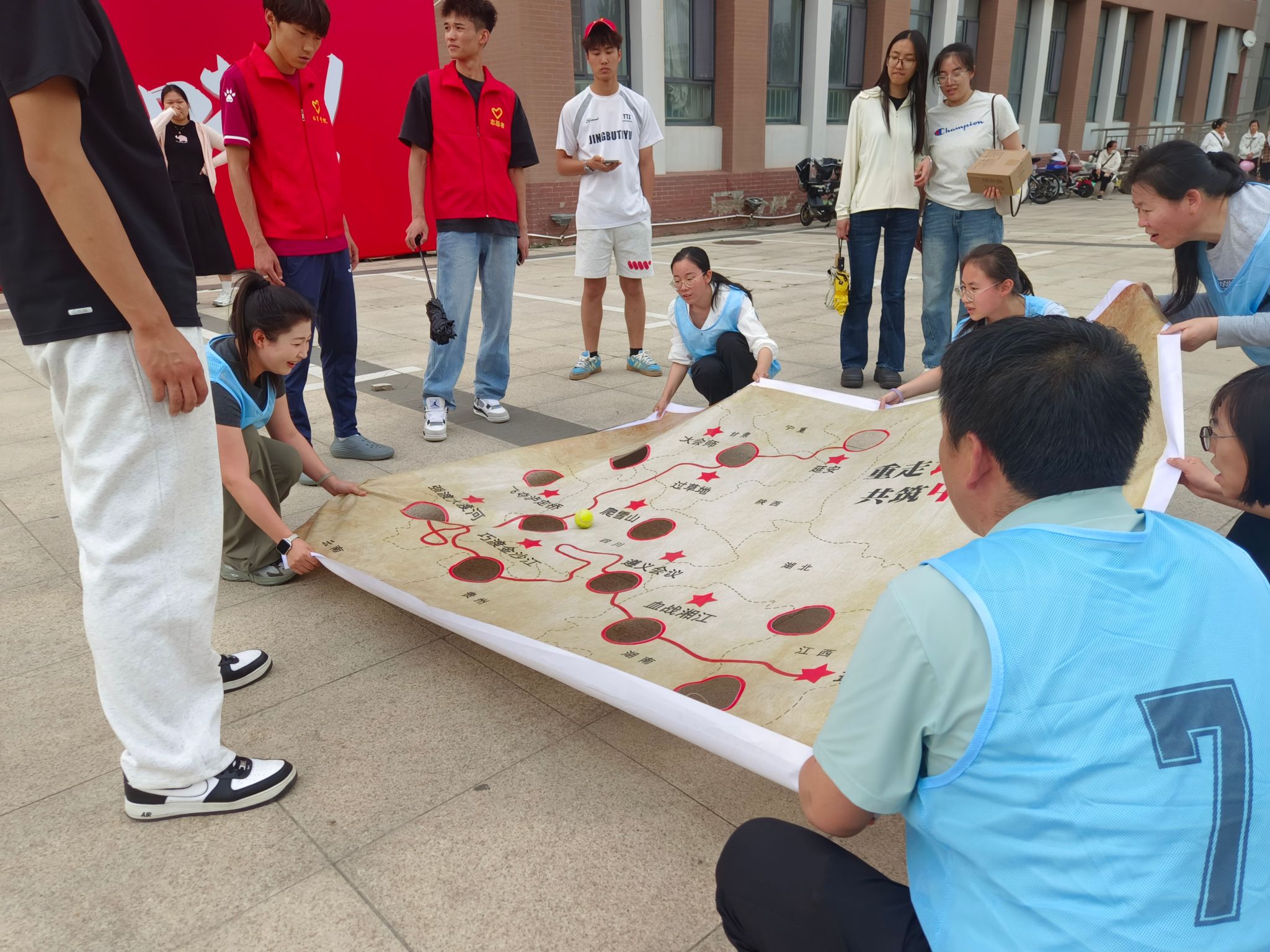 活动设计巧妙结合党史教育与团队协作。在“延安”打卡点,参与者需完成红色知识问答,回顾党的理论发展;“井冈山”任务模拟“重走长征路”,考验体力与意志;“瑞金”环节通过“同舟共济”游戏培养默契;而“遵义”的“勇闯地雷阵”和“西柏坡”的“心有灵犀”则分别强化了策略沟通与信任协作……。每个打卡点的任务都融入党史知识、红色精神学习,增强了党员的使命感。最终,我院党员团队通过默契配合获得了最佳“心有灵犀”奖。