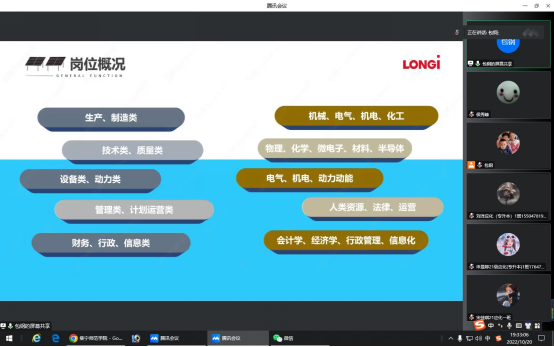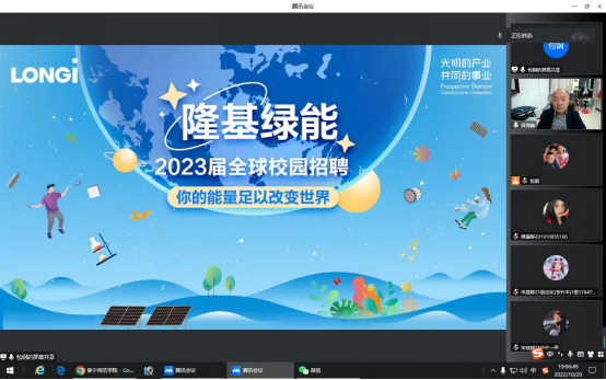 2022年10月20日晚上,化学与化工学院与隆基绿科技股份有服公通过腾讯会议共同举办校园专场招聘会,学院领导班子高度重视,党总支副书记侯秀峰、班主任范晓宇、2023届毕业生,隆基绿科技股份有服公参与本次招聘会。