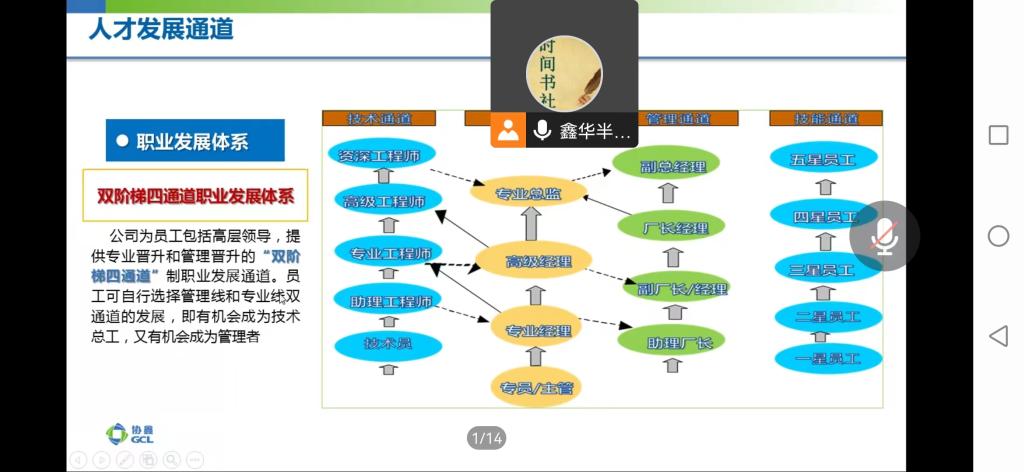 招聘会上,招聘单位力资源部经理王玉超通过播放宣传片、PPT展示、线上面对面交流等方式向同学们介绍公司的概况、职业发展方向、人员需求以及选择该单位的理由等。已入职江苏鑫华半导体科技股份有限公司,2022届化学1班毕业生刘文静、卢帅两位同学,就入职以来的亲身经历和同学们进行了分享,使同学们对公司有了更深刻的了解,此外,学生在关心薪资前景的同时更为详细的咨询了合同签订的相关事宜,少了些盲目,多了些理性。