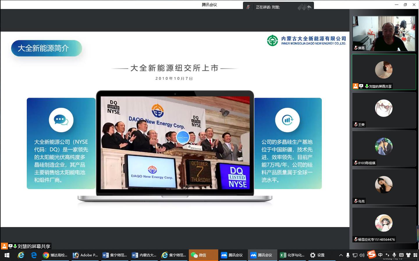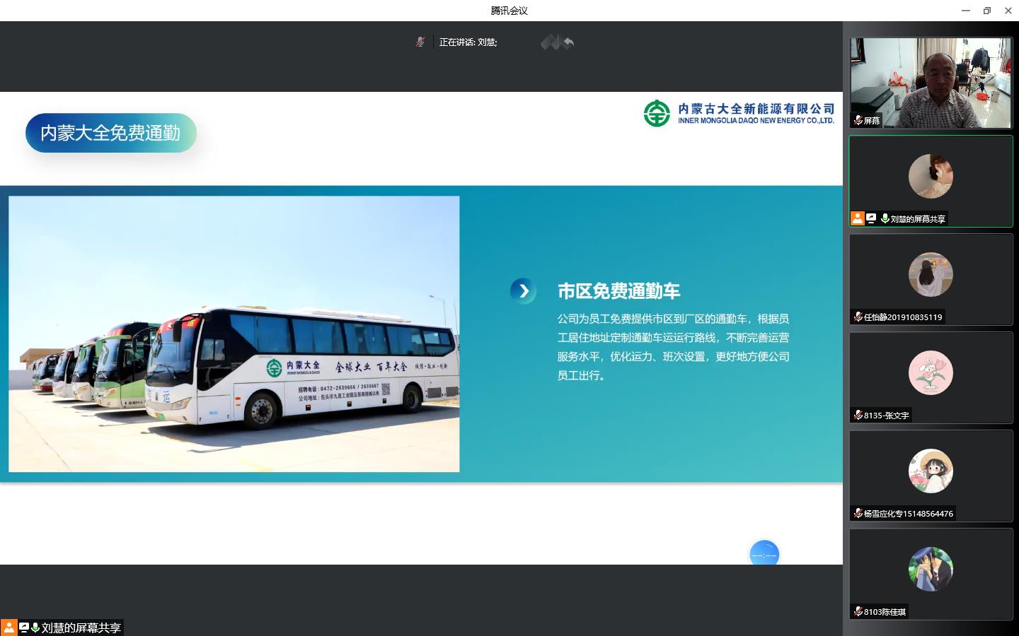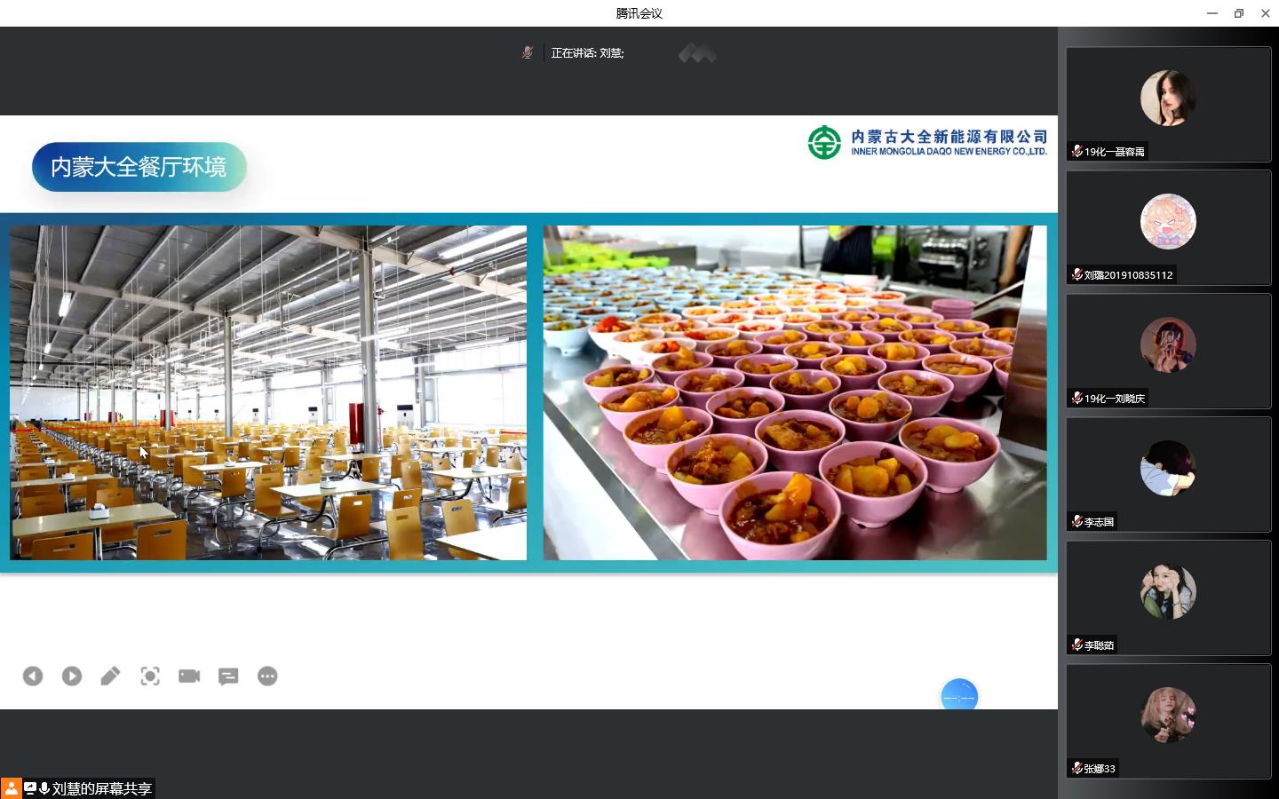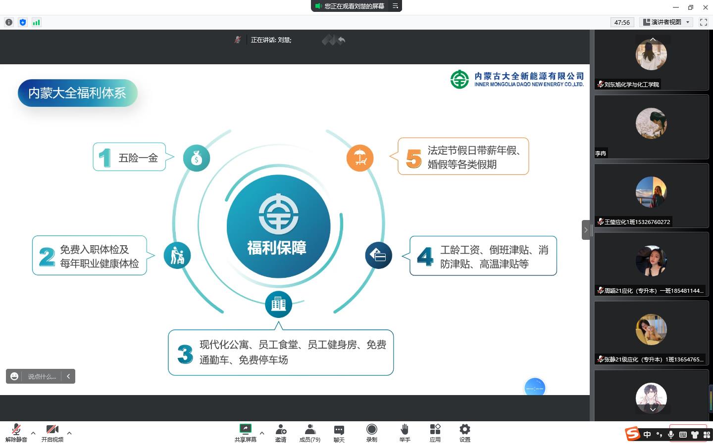 2022年10月15日下午,化学与化工学院与内蒙古大全新能源有限公司共同举办秋季校园线上招聘会,学院党总支副书记侯秀峰、班主任范晓宇、2023届毕业生,集团人力资源部招聘培训经理梁磊,公司行政人事部招聘专员李志国、刘慧参与本次招聘会。