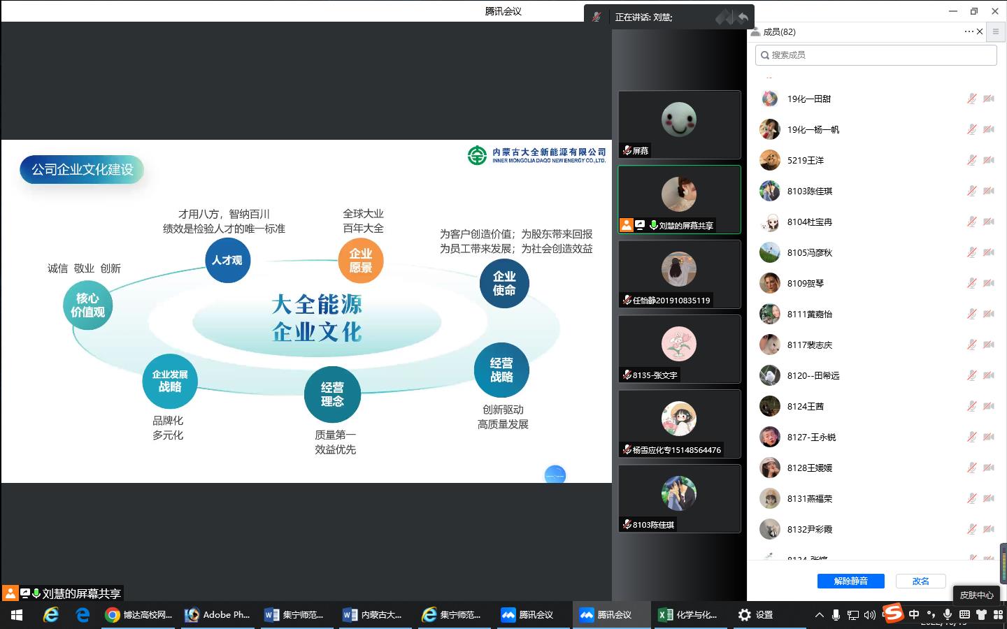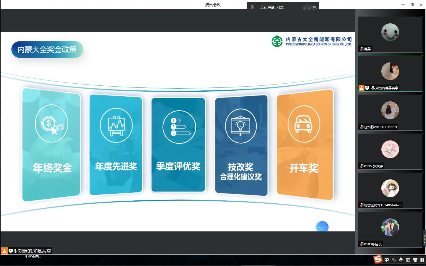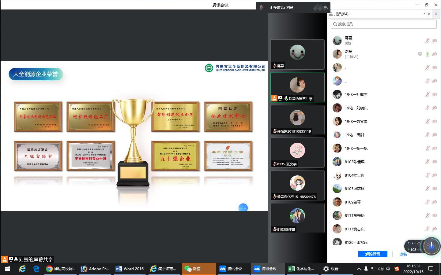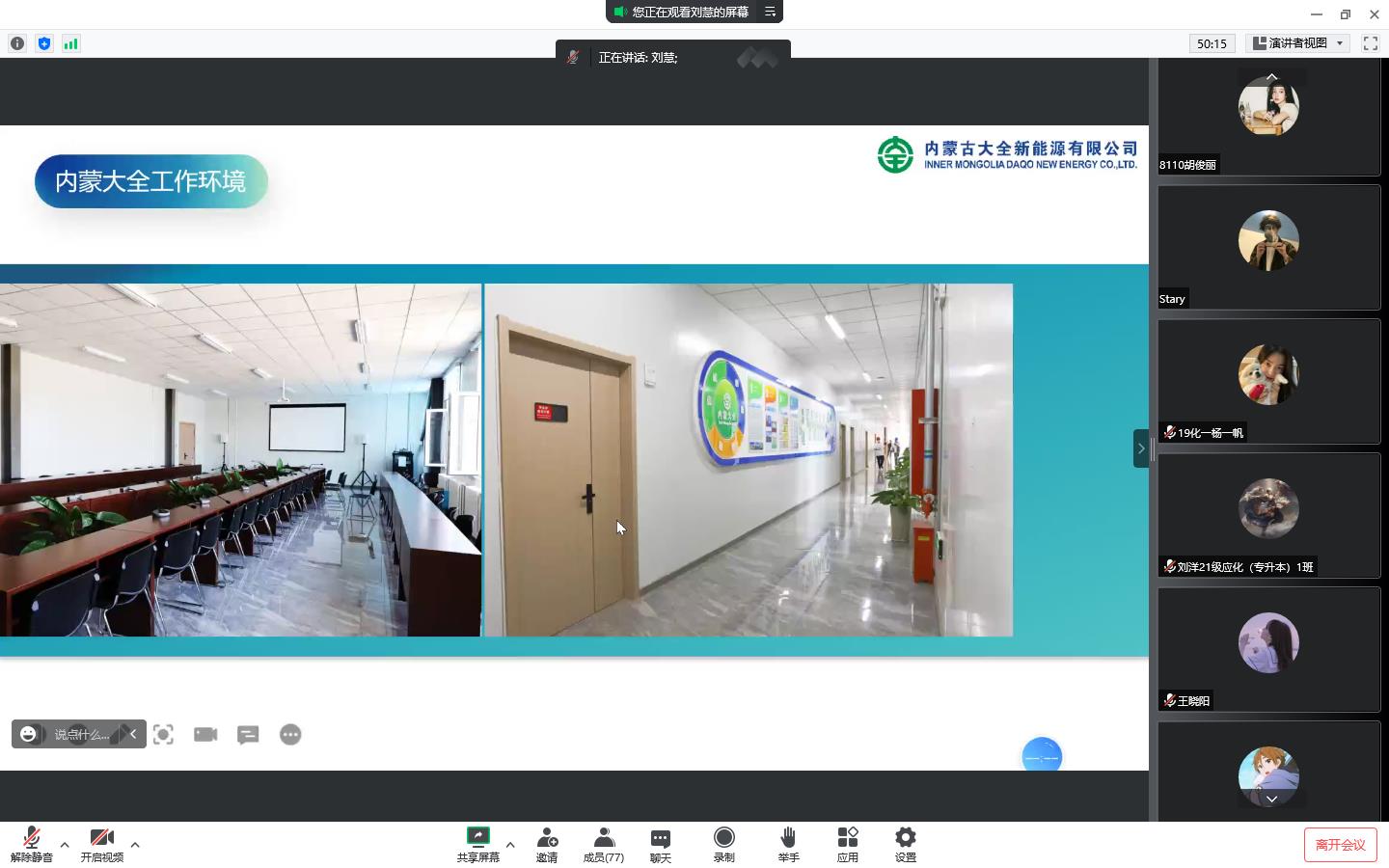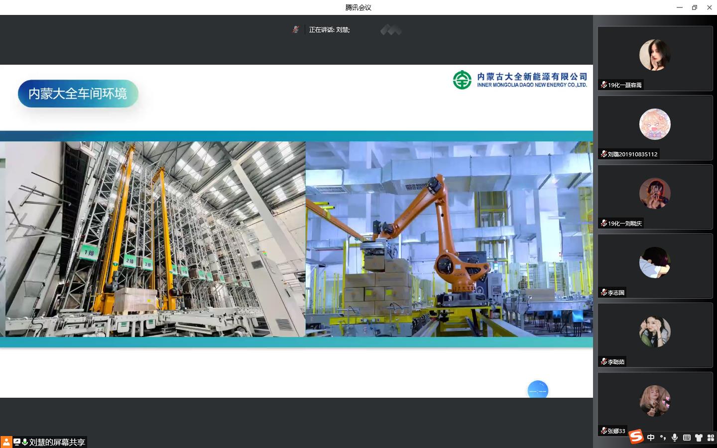 2022年10月15日下午,化学与化工学院与内蒙古大全新能源有限公司共同举办秋季校园线上招聘会,学院党总支副书记侯秀峰、班主任范晓宇、2023届毕业生,集团人力资源部招聘培训经理梁磊,公司行政人事部招聘专员李志国、刘慧参与本次招聘会。