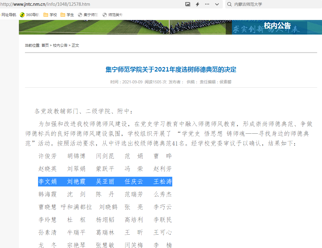 李文娟,1982年4月出生。2005年7月毕业于内蒙古师范大学化学与环境学院,取得学士学位; 2018年1月毕业于内蒙古工业大学化工学院,获得工程硕士学位。本人承担了《无机及分析化学》、《绿色化学》、《乳品化学》、《分析化学》、《仪器分析化学实验》、《分析化学实验》等专业课程讲授,工作量饱满。主持并参与4项自治区级课题、5项校级课题,参编教材2部,发表10多篇学术论文。曾担任乌兰察布市三届、四届政协委员,获得优秀政协委员、优秀提案奖等多项奖励。