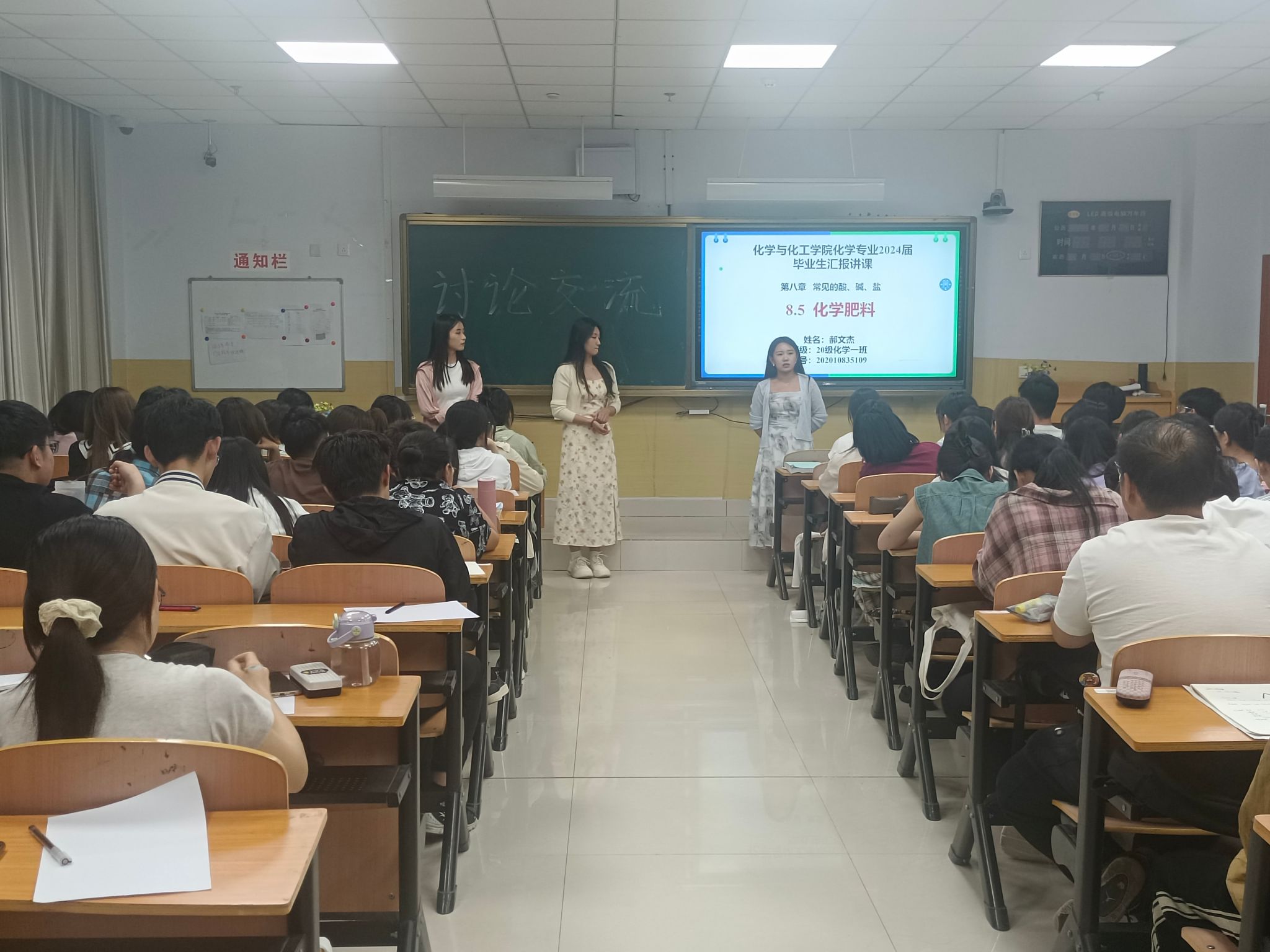 为提高师范生培养质量,检验教育实习效果。2024年6月20日晚上19:20,化学与化工学院在逸夫楼102教室举行2024届化学专业优秀实习生实习汇报讲课活动。2020级化学专业在实习过程中表现优秀的三位学生代表崔春旭、刘珺静和郝文杰为2021级化学专业全体学生进行了汇报讲课。