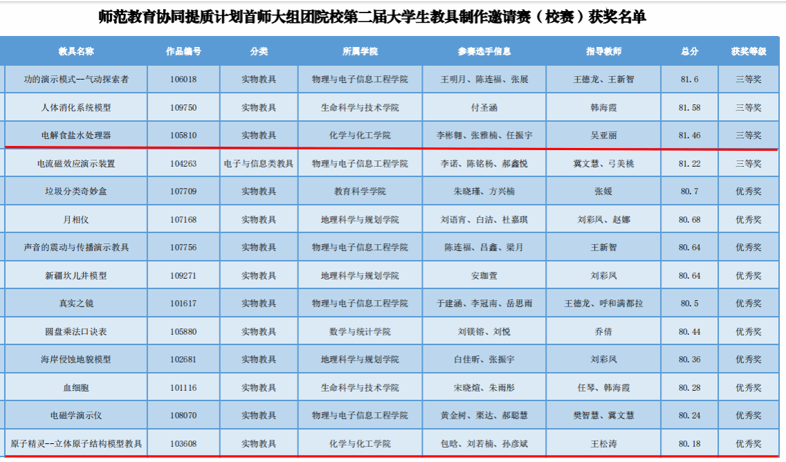 获奖作品分别是李彬翱、张雅楠、任振宇的《电解食盐水处理器》,获得校赛三等奖(指导教师吴亚丽);包晗、刘若楠、孙彦斌的《原子精灵--立体原子结构模型教具》,获得校赛优秀奖(指导教师王松涛)。