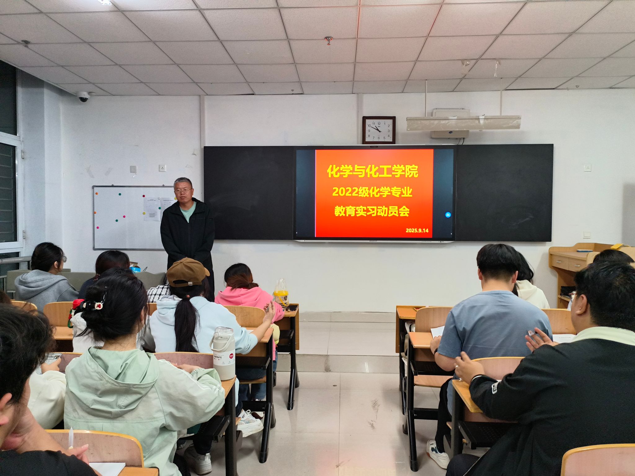 为迎接本科教育教学审核评估,扎实推进实习实践各项工作顺利开展,91420:00,化学与化工学院在逸夫楼103教室召开2022级化学专业教育实习动员会。