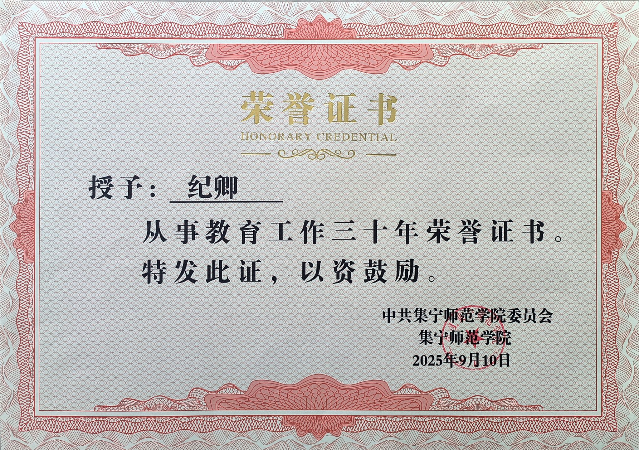2025年9月10日,正值世界杯官网迎接本科教育教学审核评估的关键时期,纪卿老师荣获“从事教育工作三十年”荣誉证书。师者匠心,止于至善;师者如光,微以致远。纪老师躬耕教坛的三十年,给我们树立了一个很好的榜样,让我们大家一起学习纪老师三十年如一日以立德树人为根本任务献身党的教育事业的认真工作态度和精神,激发起更大的工作热情和动力,为世界杯官网本科教育教学审核评估作出更大贡献。