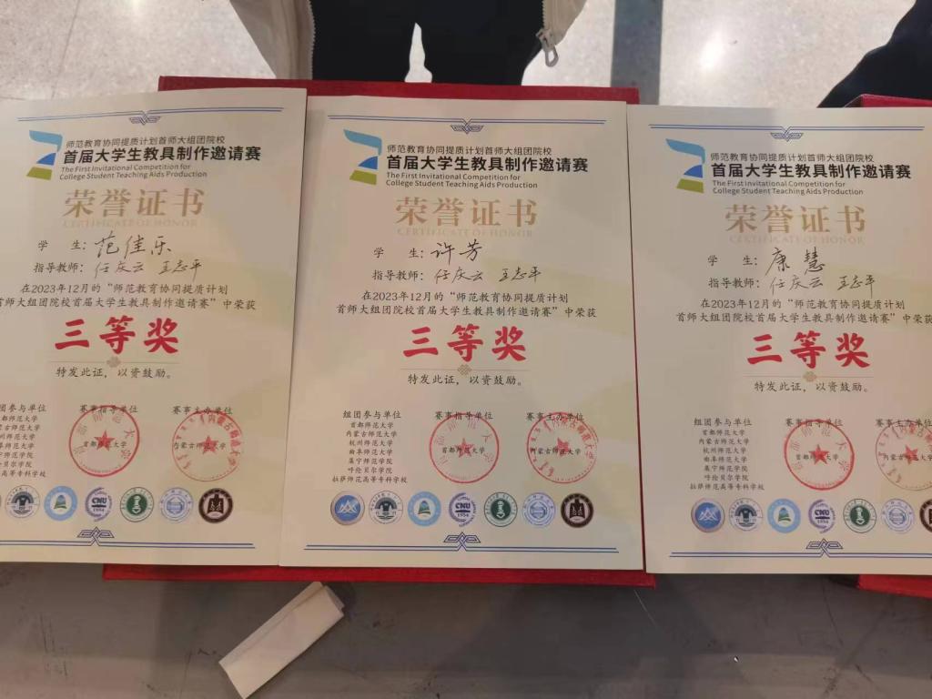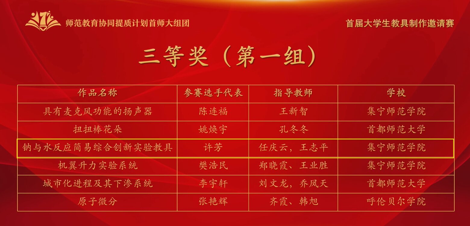 经过激烈角逐,化学与化工学院许芳、康慧、范佳乐三名学生的作品《钠与水反应简易综合创新实验教具》获得三等奖(指导教师任庆云、王志平),李彬翱、张雅楠、任振宇三名学生的《物质结构基础展示箱》教具获得优秀奖(指导教师吴亚丽)。