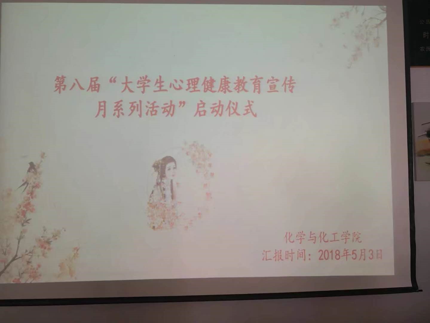 2018年5月3日下午,在逸夫楼Y103,化学与化工学院开展了“第八届‘大学生心理健康教育宣传月系列活动’启动仪式”。为了充分调动同学们关注心理健康的积极性,提高同学们对心理健康教育的重视,参加此次启动仪式的有化学与化工学院党总支副书记候秀峰、学工办主任赛汉、团总支书记乌日娜及我院2017级全体学生。