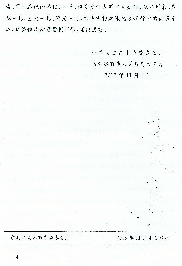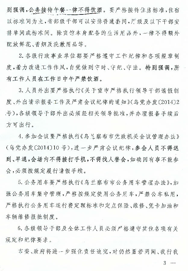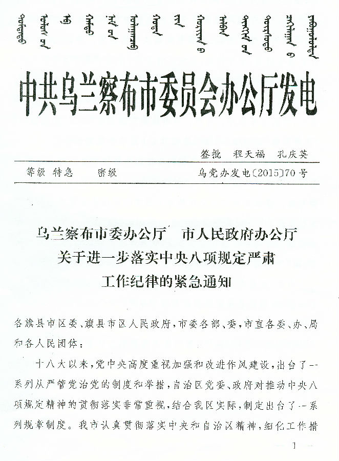 现将中共乌兰察布市委员会办公厅、乌兰察布市人民政府办公厅《关于进一步落实中央八项规定严肃工作纪律的紧急通知》(乌党办发电〔2015〕70号)转发给你们,请认真学习并严格执行。