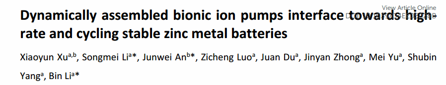 该成果以"Dynamically assembled bionic ion pumps interface towards high-rate and cycling stable zinc metal batteries"为题发表在《Energy & Environmental Science》期刊,第一作者是Xu Xiaoyun。