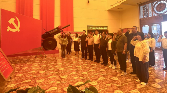 在党旗下,全体党员庄重地举起右手重温入党誓词,表达了为党的革命事业奋斗终生的决心。