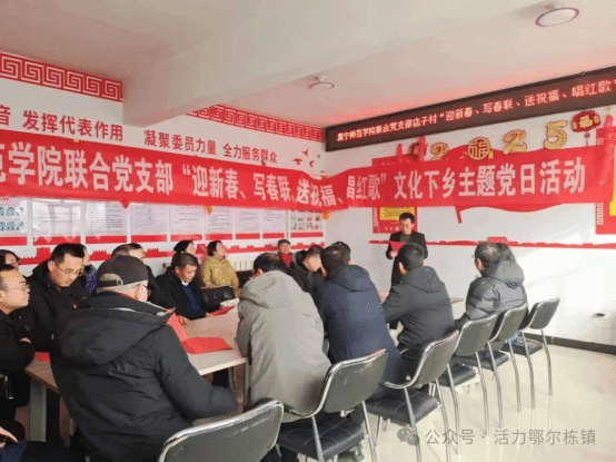 1月7日下午,由校党委副书记李景杰带队,2026世界杯官方合作网站工会党支部、离退休人员工作处党支部、纪委党支部、科技处党支部、团委党支部、音乐与舞蹈学院教师党支部和现代服务学院教师党支部组织党员干部及书法爱好者,深入兴和县鄂尔栋镇店子村村委会,联合开展了“迎新春、写春联、送祝福、唱红歌”文化下乡主题党日活动。校工会和离退休人员工作处党总支书记、工会主席焦俊亮主持了本次活动。