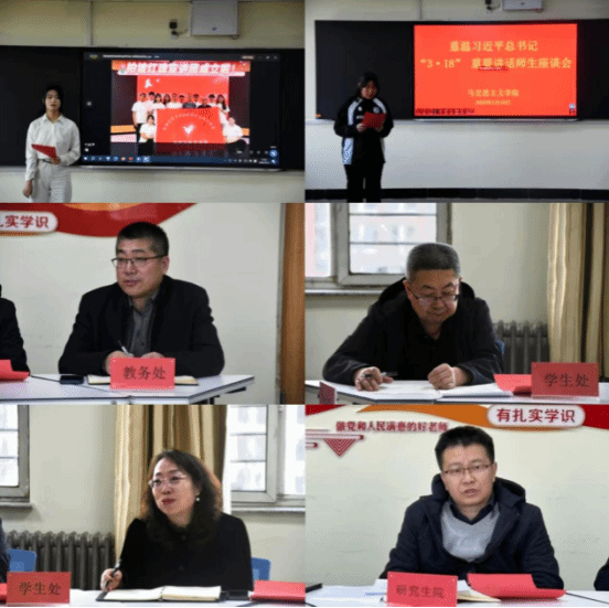 3月18日下午,学校举行重温习近平总书记“3·18”重要讲话师生座谈会。校党委书记张宝成,校党委委员、副校长拓俊杰,校党委委员、宣传部部长郭英出席会议,学校相关职能部门负责人和思政课教师代表及学生代表共聚一堂,深入交流学习体会,共谋学校思政课建设新篇章。马克思主义学院副院长郭永兴主持座谈会。