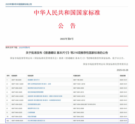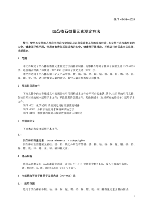 2025年3月28日,中华人民共和国国家标准网站发布公告(2025年第6号),国家市场监督管理总局、国家标准化管理委员会联合批准了国家标准《凹凸棒石微量元素测定方法》,该国家标准将于2025年10月1日正式实施。