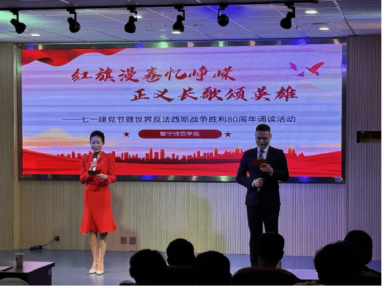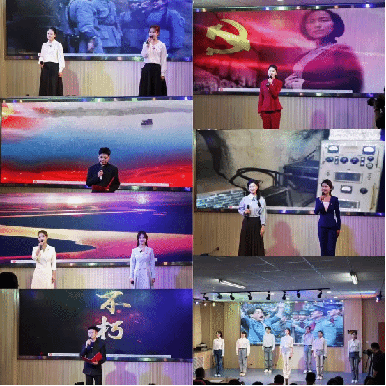一场震撼心灵的视听盛宴在朗诵声中开启。同学们铿锵有力、饱含深情地诵读《红船,从南湖起航》《不朽》等七部经典红色作品,带领现场观众回溯中国共产党波澜壮阔的奋斗历程。吴克强以激昂的朗诵,重现南湖红船星火初燃的壮丽场景;张瑞霞与张世羽默契配合,用声情并茂的演绎,勾勒出山河画卷中炽热的赤子情怀;金烜铭以铿锵有力的咏叹,在《红梅赞歌》中生动诠释江姐坚如钢铁的革命意志;陈延与杜鑫圆用《我们的青春》致敬激情燃烧的岁月;赵军以《不朽》诉说英雄的永恒;高婧旖与孟鑫的《永不消逝的声音》,唤醒人们对革命时期声音战线的记忆;王渤涵等同学带来的《密码》,解密信仰之光。同学们从多元视角深刻诠释了红色精神的内涵,引发全场强烈共鸣。