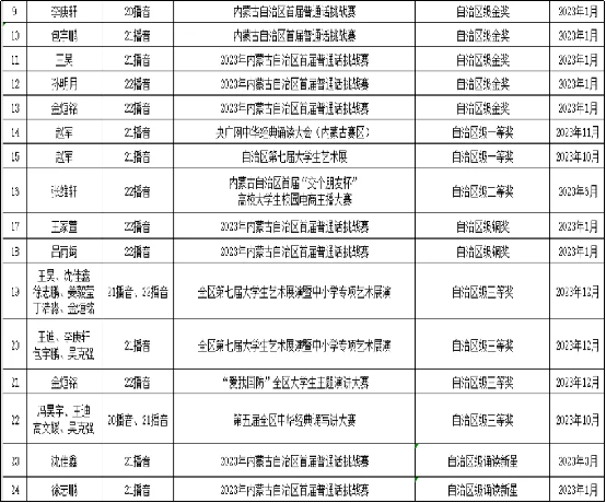 学院秉承“把三全育人内化到建设和管理各领域、各方面、各环节”的理念,把实践教学、社会实践和校园文化活动作为人才培养和学生成长必不可少的重要环节,强化学用结合,积极打造“第二课堂”,开展主题活动,组织学生参加校内外各级各类比赛,丰富学生课外生活,引导学生展现专业特点,展现青春自信。近三年学生参加各类比赛共获国家级一等奖3项,自治区一等奖9项(详见下表)。学院获各级优秀组织奖12项。