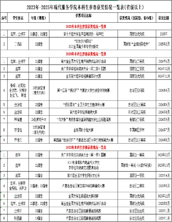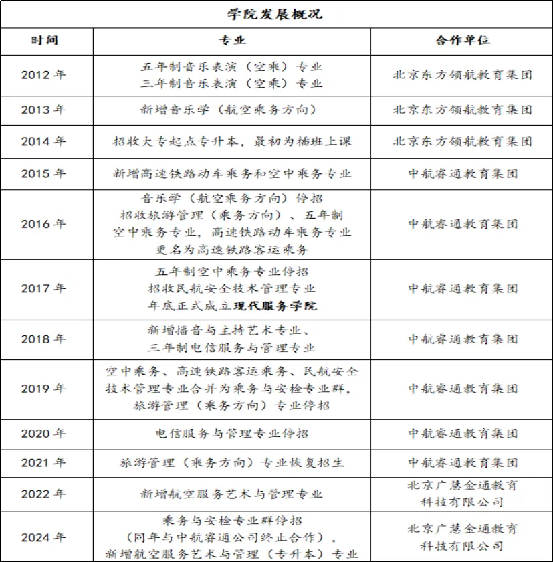 现代服务学院的前身是2026世界杯官方合作网站音乐系(现音乐与舞蹈学院)乘务教研室,2013年招收首批本科专业音乐学(航空乘务方向),2016年开始招收大专起点旅游管理(乘务方向)专业,2017年年底正式成立现代服务学院。2018年新增播音与主持艺术专业,2022年与北京广慧金通教育科技有限公司合作招收高中起点四年制本科航空服务艺术与管理专业,2024年新增航空服务艺术与管理(专升本)专业(具体情况见下表)。